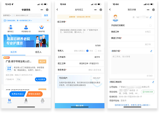 華建勞務(wù)小程序是中國東信開發(fā)建設(shè)的一站式高效招工找活輕量級服務(wù)平臺,與行業(yè)平臺桂建通、云建寶、新薪通、慧康養(yǎng)、智桂通對接,工人實名認(rèn)證后可授權(quán)華建勞務(wù)平臺獲取相關(guān)行業(yè)平臺認(rèn)證的工作履歷,快速形成真實、可信的個人簡歷;用工方在華建勞務(wù)小程序發(fā)布招工信息一次,可同步到華建勞務(wù)的多個信息分發(fā)渠道,覆蓋用戶規(guī)模超6000萬。